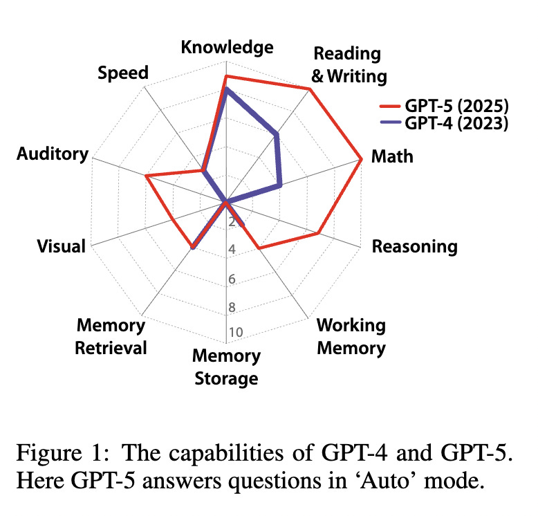 In 2025, Yoshua Bengio, Turing Award winner and one of the most cited AI scientists, along with 20+ other prominent people, built on the 2023 DeepMind paper in a new paper, “A definition of AGI”. Rather than vaguely saying an AGI needs to be able to do a “a wide range” of tasks, it made a list of 10 key cognitive capabilities, and compared AI to human performance on them.