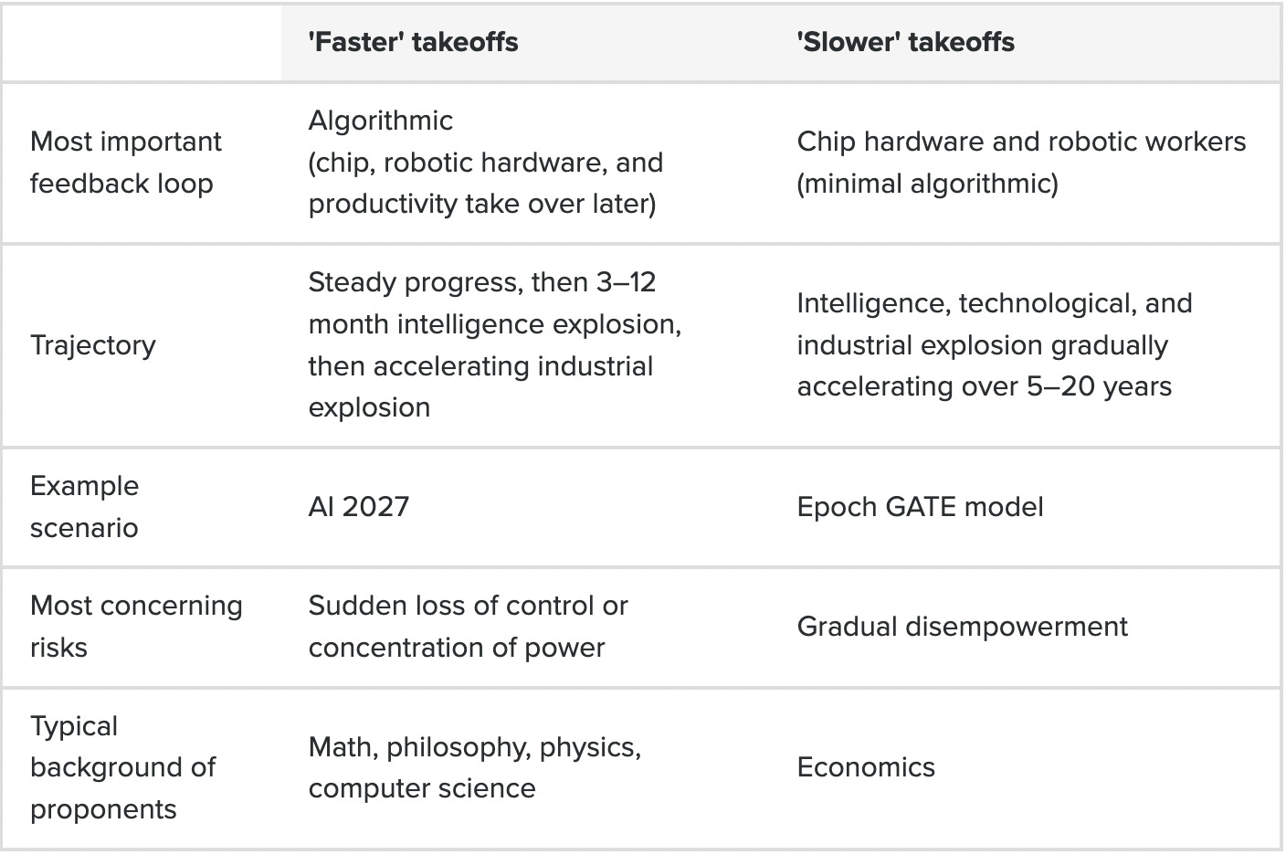 The second, slower takeoff camp thinks an algorithmic feedback loop isn’t possible, but they still think the intelligence, technological, and industrial explosions will happen. The difference is these explosions would need to be driven by the chip hardware, robotic worker, and productivity feedback loops instead.