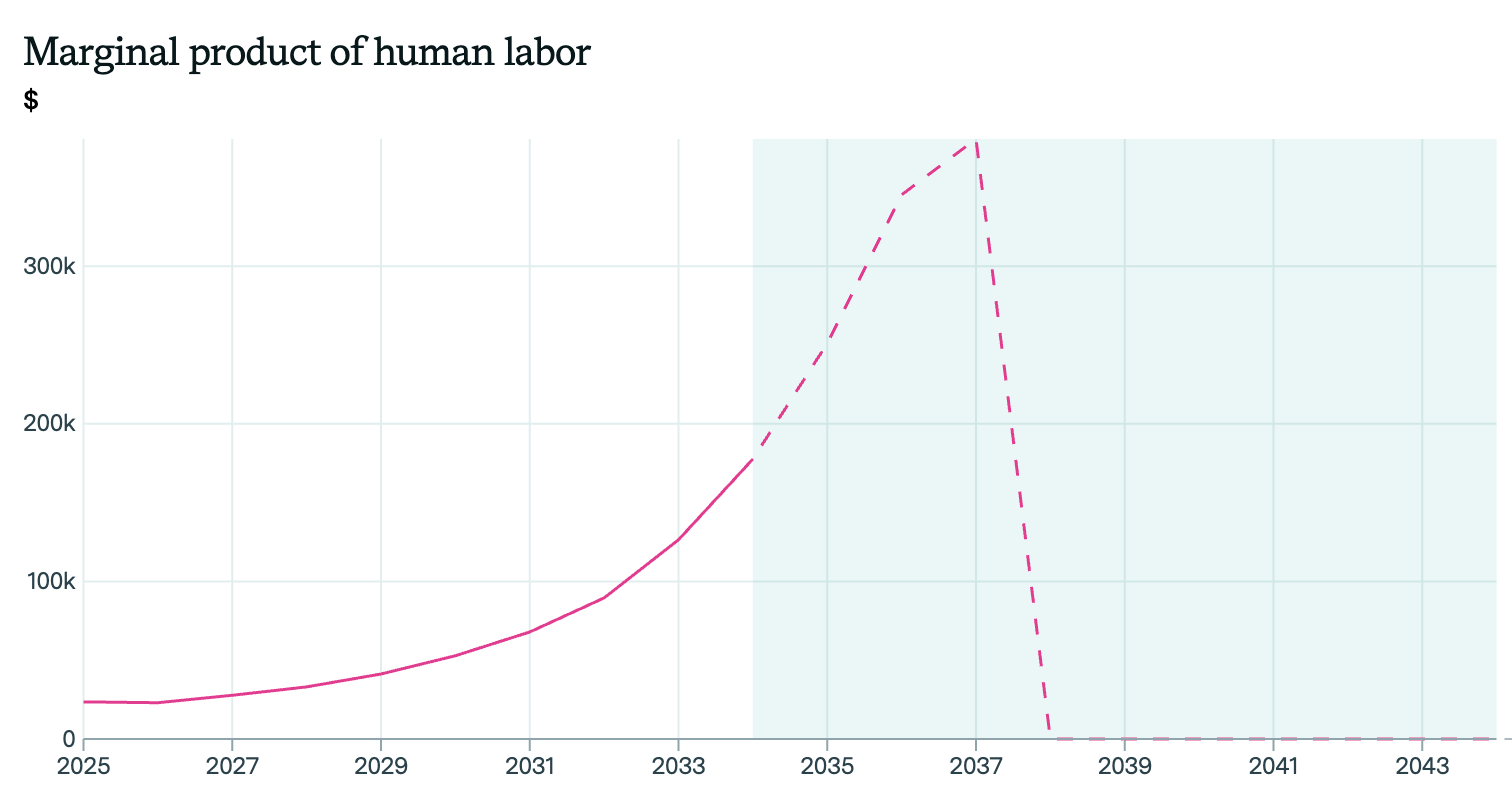 I’m not saying this is what will happen, but it’s one possible scenario. Epoch has also made an integrated model of how full automation might unfold across the economy. With their default assumptions, wages initially increase about 10x, only to plunge in the late 2030s as the final human bottlenecks are removed.
