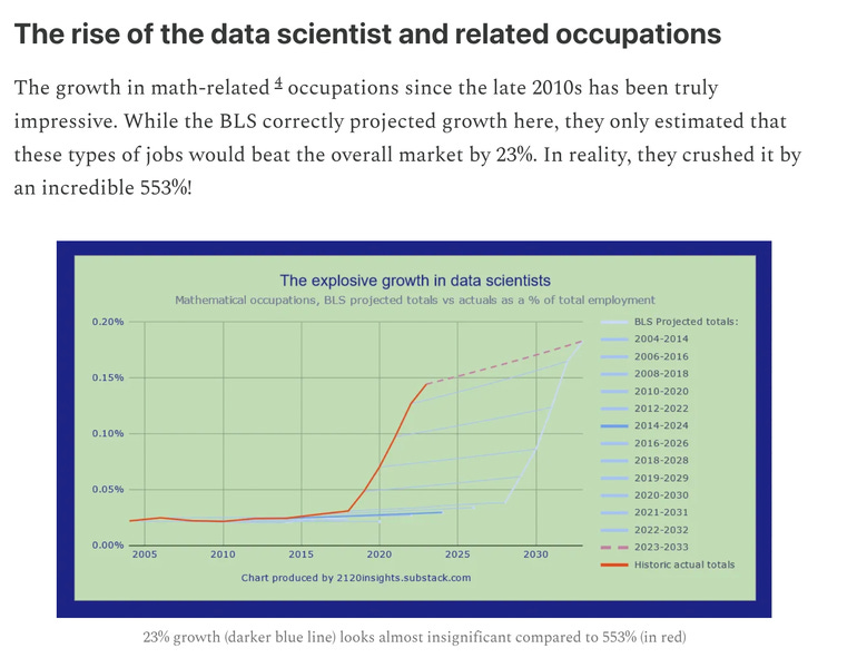 Data science employment, however, was still up 20% during 2023, despite AI being pretty good at quick statistical analysis and visualisation.4 So far, AI has maybe made data scientists more useful, rather than replace them. (It remains to be seen how long that will last.)