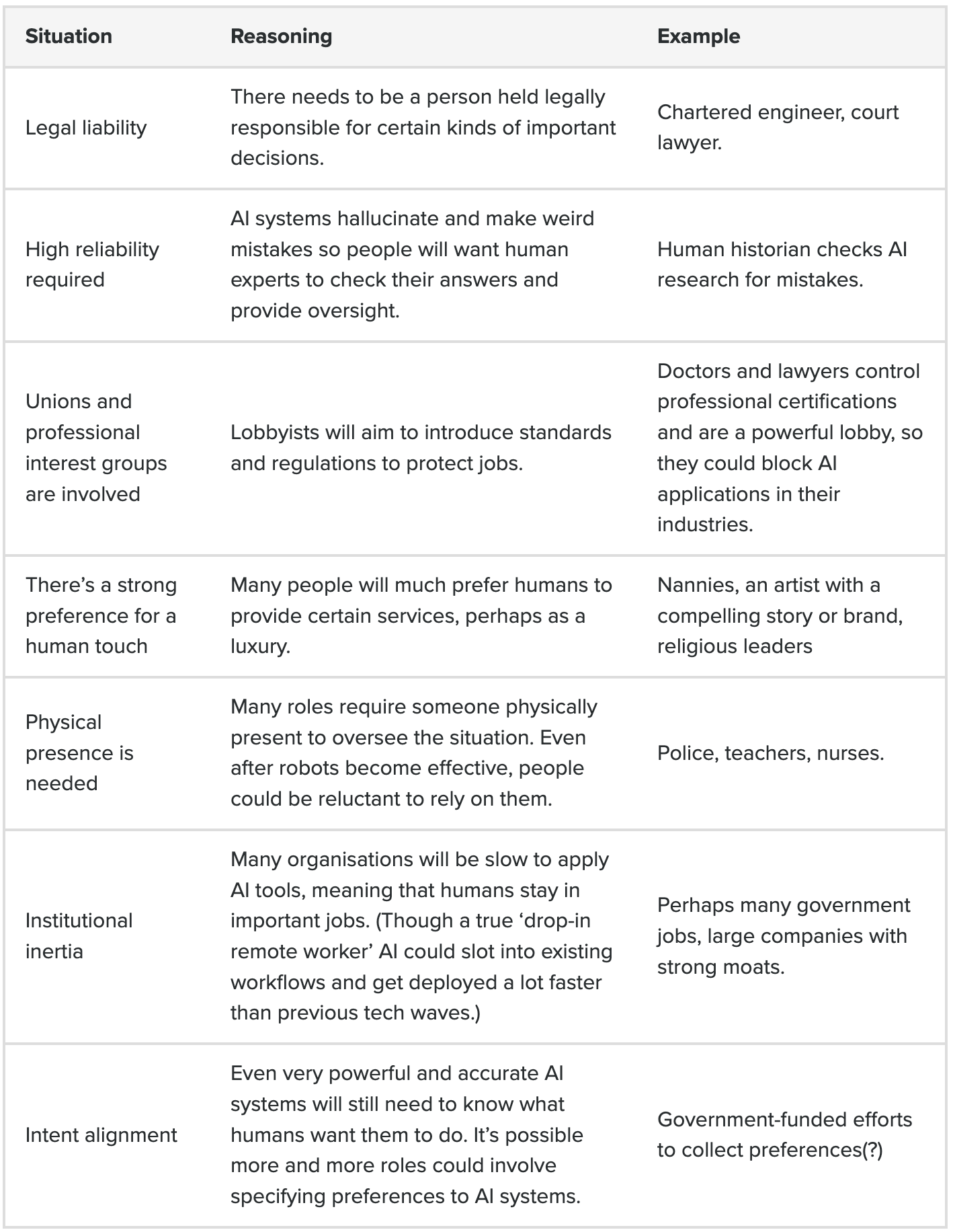 Even if AI can technically do a task, it might not be allowed to do so because people often want a person-in-the-loop. Here are the main categories I’ve seen suggested by economists where this could be the case (e.g. see this interview with Mike Webb):