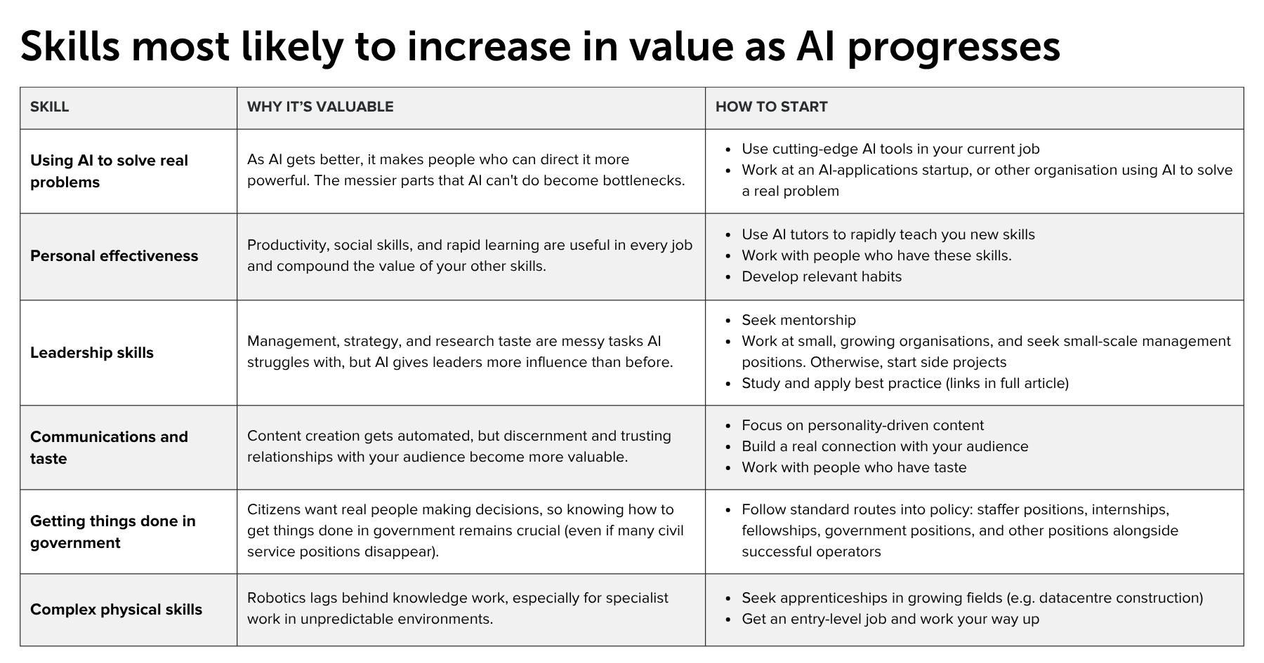 Expertise will be most valuable in sectors likely to grow a lot — such as AI deployment, AI development, robotics, computer hardware, cybersecurity, and power generation — and in crucial areas of government policy (e.g. US-China relations, AI regulation, defence).