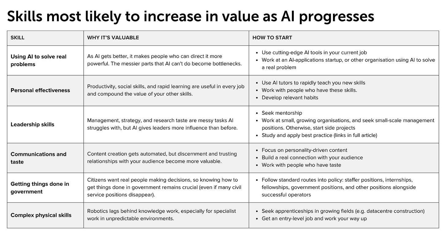 Use the existing research, economic theory, recent data, and an understanding of how AI works to identify the types of skills most likely to increase in value due to AI. In brief, these are skills that (i) are hard for AI, (ii) complementary to its deployment, (iii) produce outputs we could use far more of, and (iv) are hard for others to learn