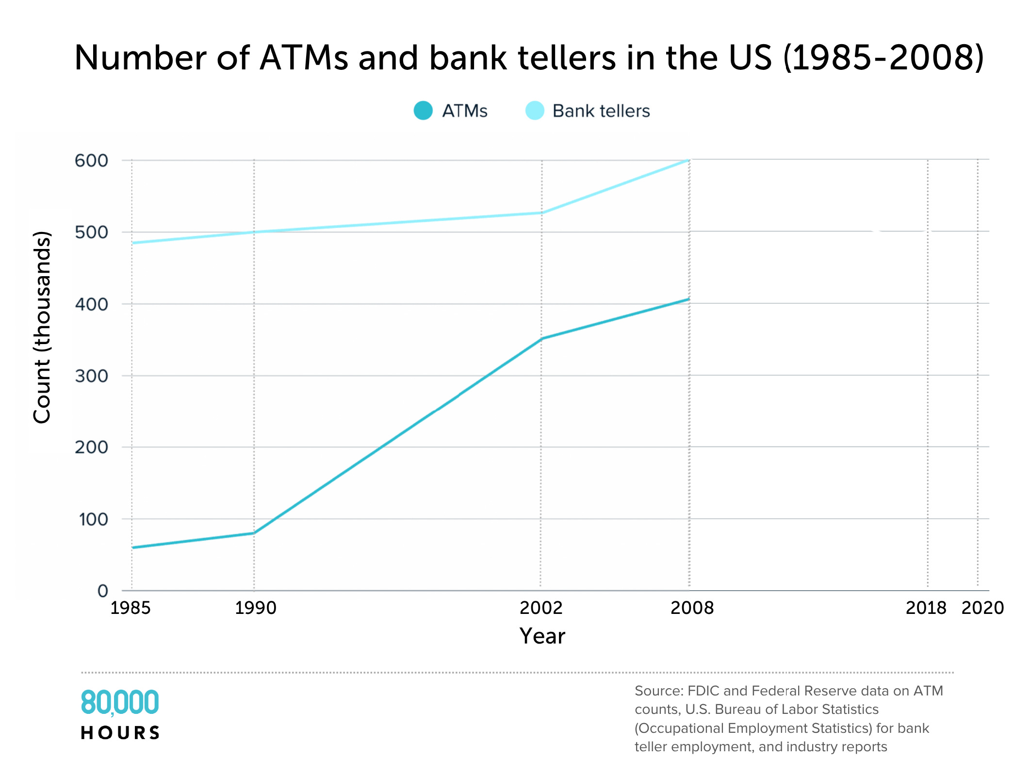 In the mid-1990s, ATMs started to show up in banks. At the time, people expected that would put many tellers out of the job.3